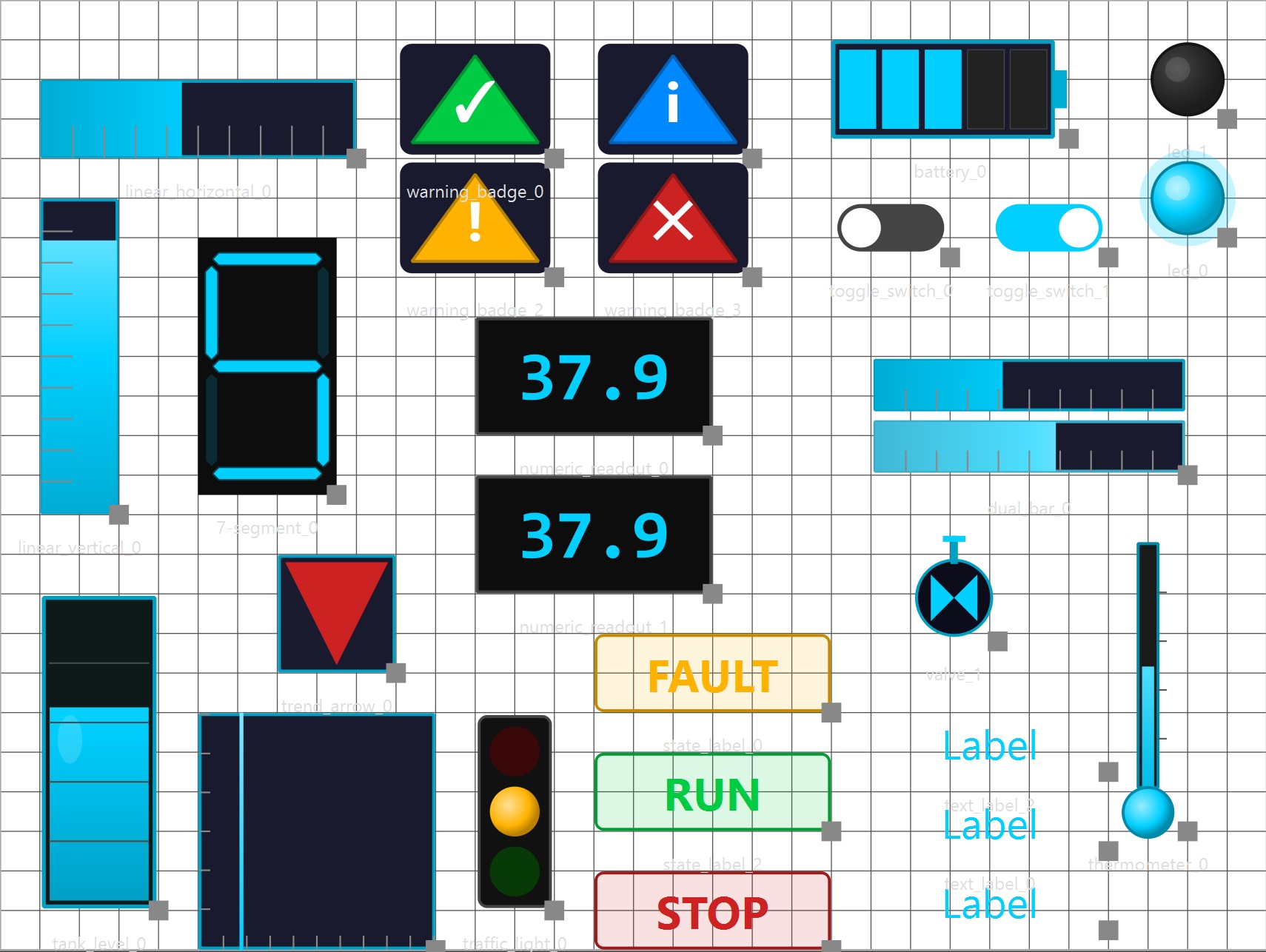 Figure 1. Examples of graphical components supported by Lacerta, including buttons, horizontal and vertical bars, numeric indicators, and status indicators used to visualize real-time system data.