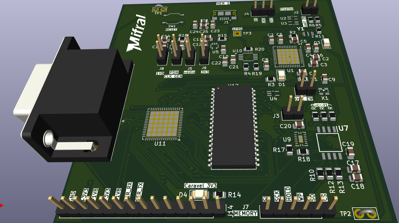 Figure 7. 3D rendering of the Lacerta Board, illustrating component placement and layout, including the Caravel/Lacerta chip placement, voltage regulators, clock generation circuitry, SPI Flash memory interface, GPIO headers, and peripheral connectors, providing a realistic view of the assembled hardware platform.