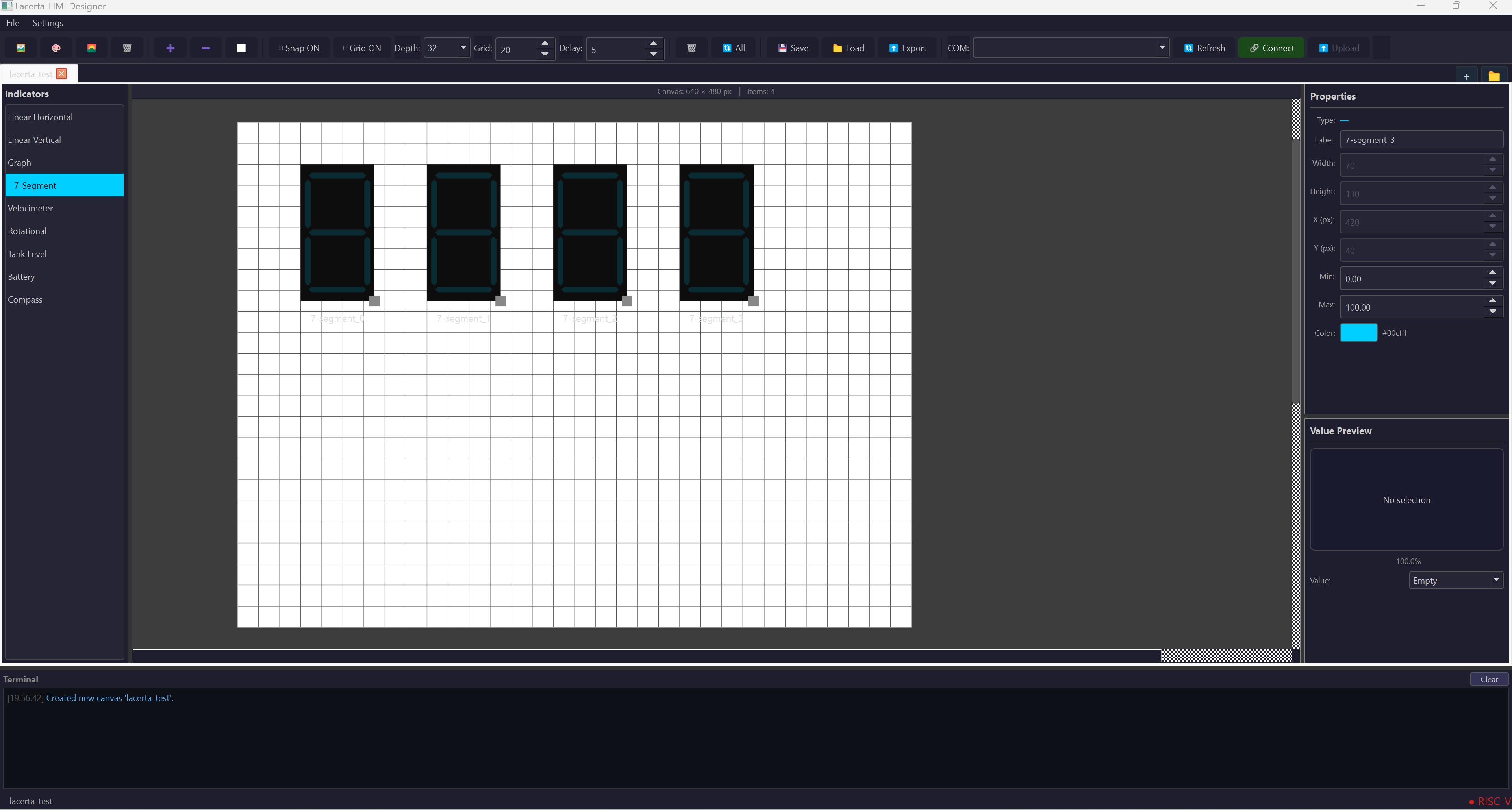 Figure 6. Graphical editor of the Lacerta Interface Design Software, where users can design custom embedded interfaces by arranging graphical components such as seven-segment displays, bars, and indicators.